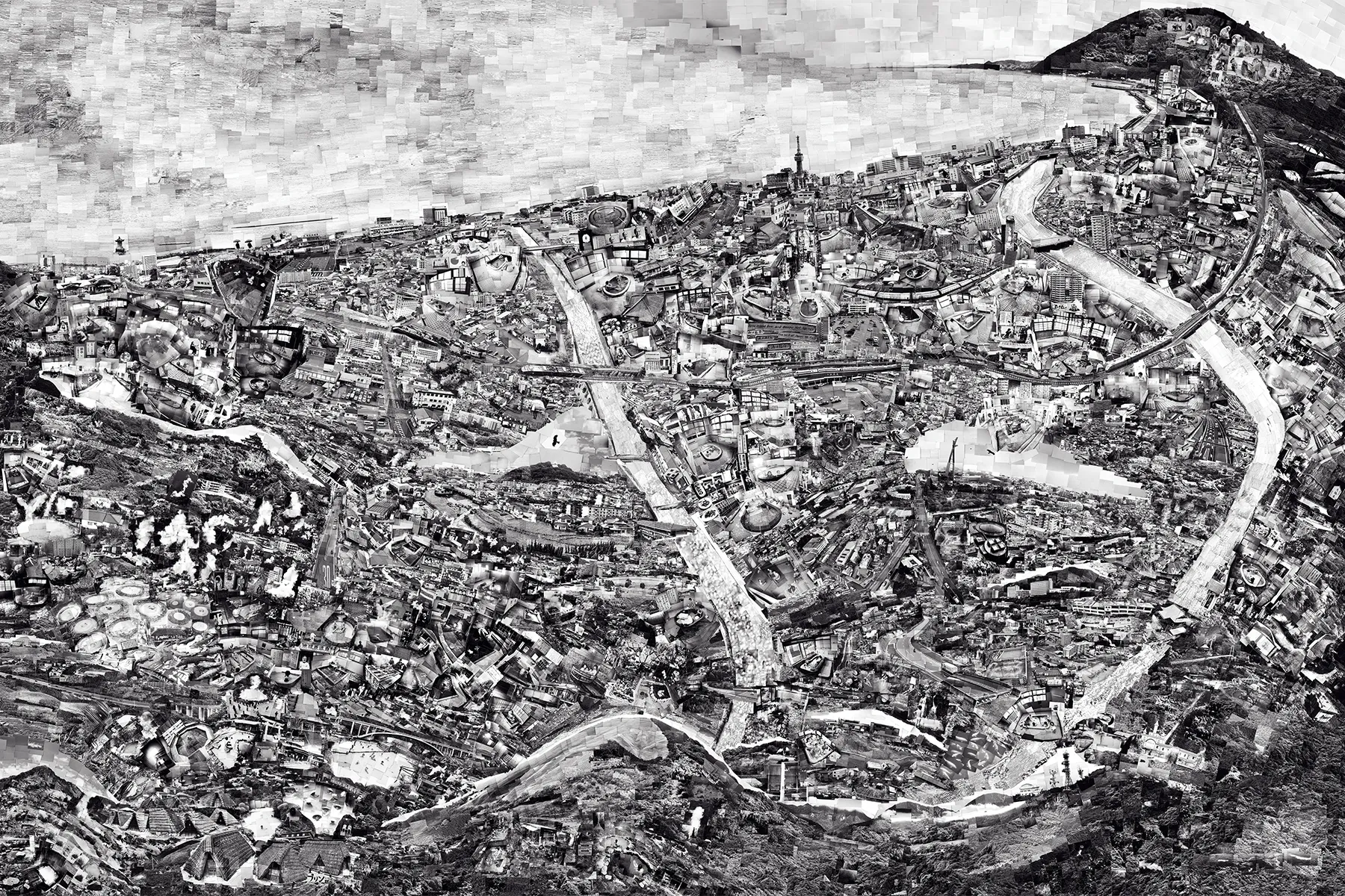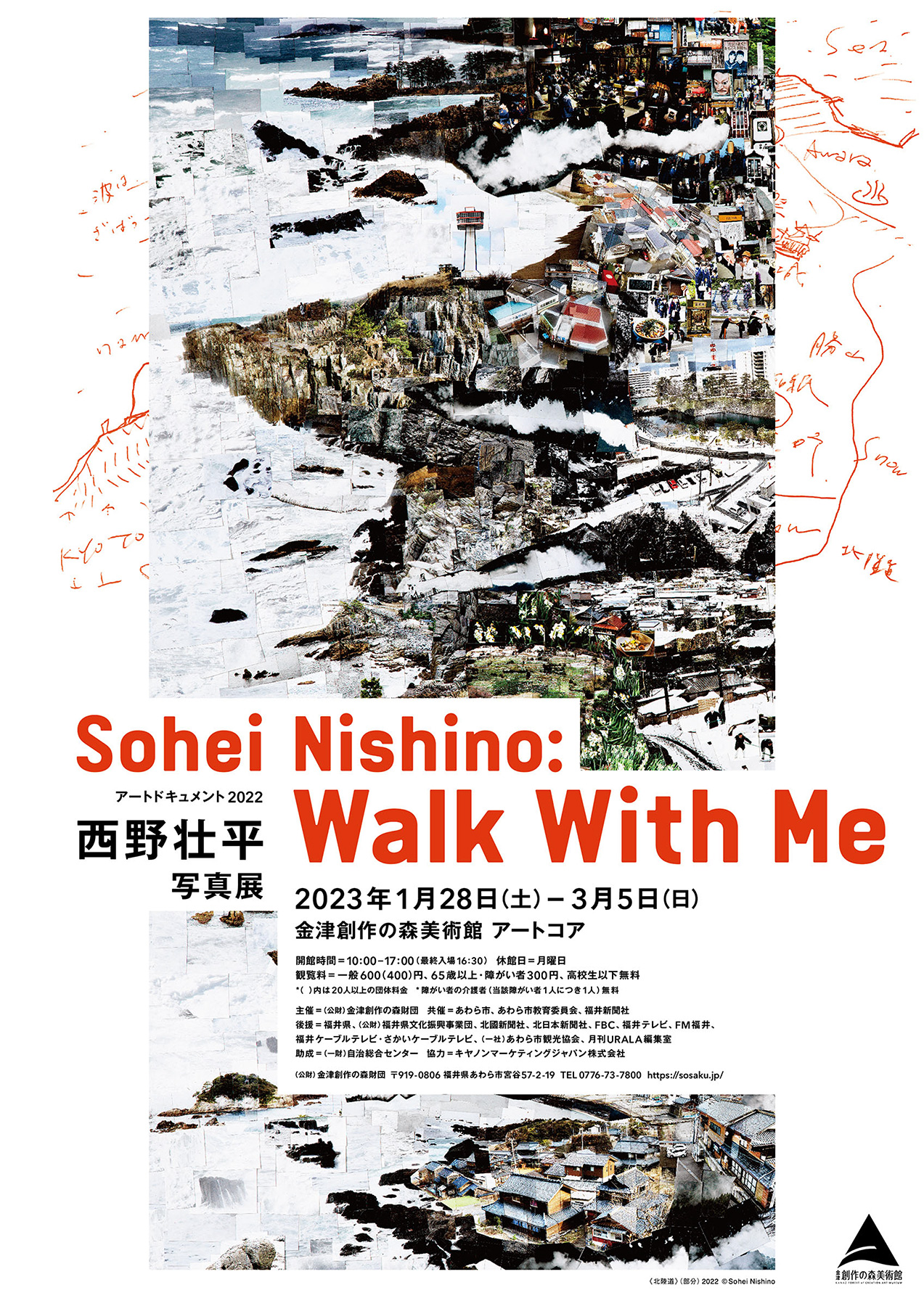 「森はあらゆる芸術の源である」という基本理念のもと、1998年の開館以来、アートドキュメントの名称で様々な分野のアートを紹介してきました。25回目の今回は、旅をテーマに世界の都市を歩き、旅を通して得た個人的な体験をもとに作品を制作している写真家・西野壮平を招待し開催します。デジタルの時代にアナログな手法にこだわり、モノクロフィルムで撮影した膨大な数の写真を一枚一枚手作業で貼り合わせながら独自の地図へとコラージュしていき、卓越した構成力によって仕上げられた作品は、記憶の断片が有機的につながるひとつの生命体のようであり、その独創的なスタイルと表現力は国内外で高く評価されています。西野は大学在学中に歩いて撮影した都市の断片を、記憶をもとに繋ぎ合わせて再構築した地図のような写真作品「Diorama Map」シリーズの制作をはじめます。本展では、現在の東海道を歩いて約3年の制作期間を経て34メートルの巻物として結実させた《東海道》(2017年)や、コロナ禍で新たに制作した作品《Mountain Line Mt. Fuji》(2021)などの6つのプロジェクトの作品を紹介します。さらに、2024年3月・北陸新幹線福井開業を見据えて、あわら市から京都までを巡る北陸道の現在を撮影取材した新作に挑みます。1点の作品を仕上げるために数千枚、数万枚の写真を貼り合わせるという、まさに心身のエネルギーをぶつけて挑んだ大作の数々をぜひ間近でご覧ください。