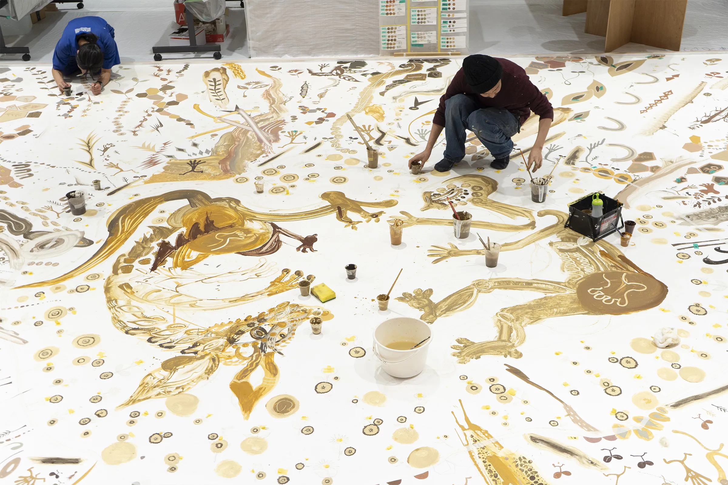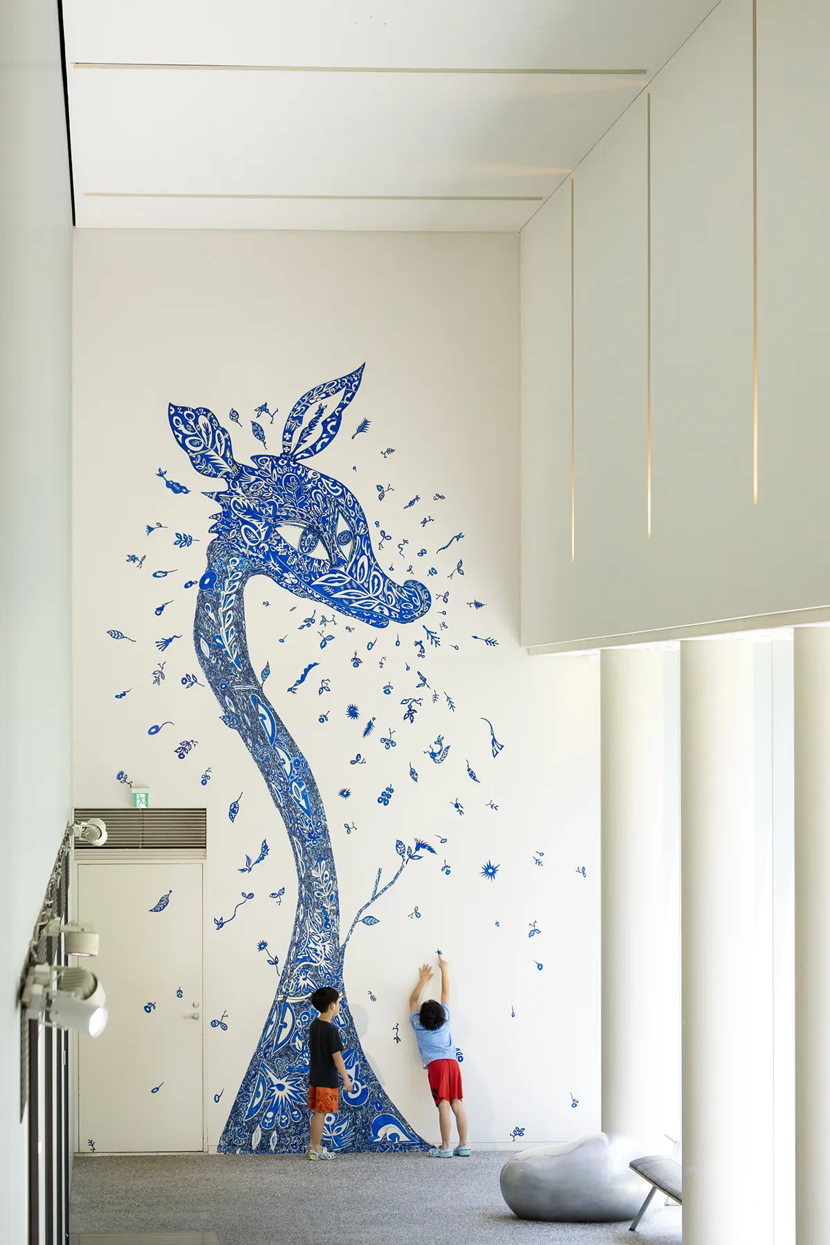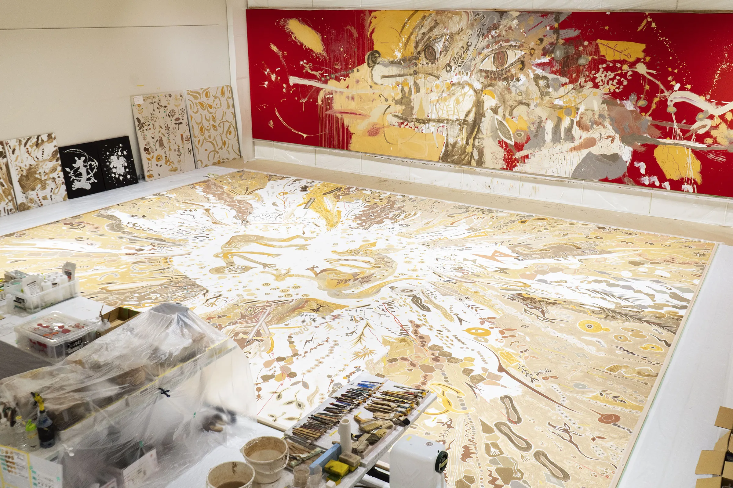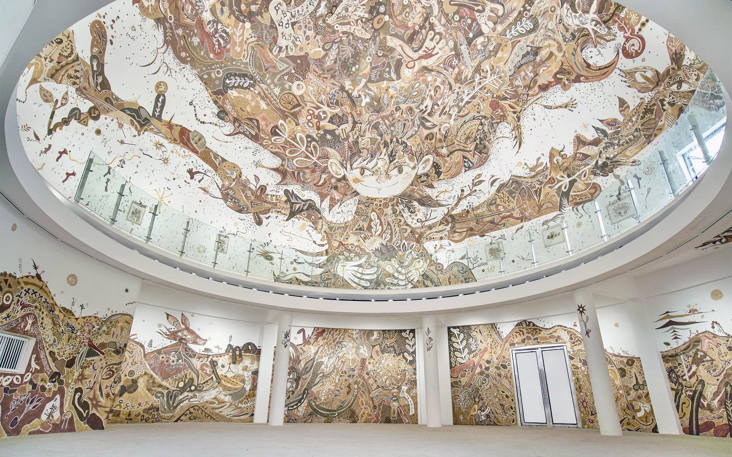 淺井裕介は、土や石、水、テープなど身近な素材を用い、マッチ箱から50mを超える壁画まで、アートプロジェクトにおけるインスタレーションへの取り組みなど、受け止める場所や環境にしなやかに呼応して奔放に描きます。