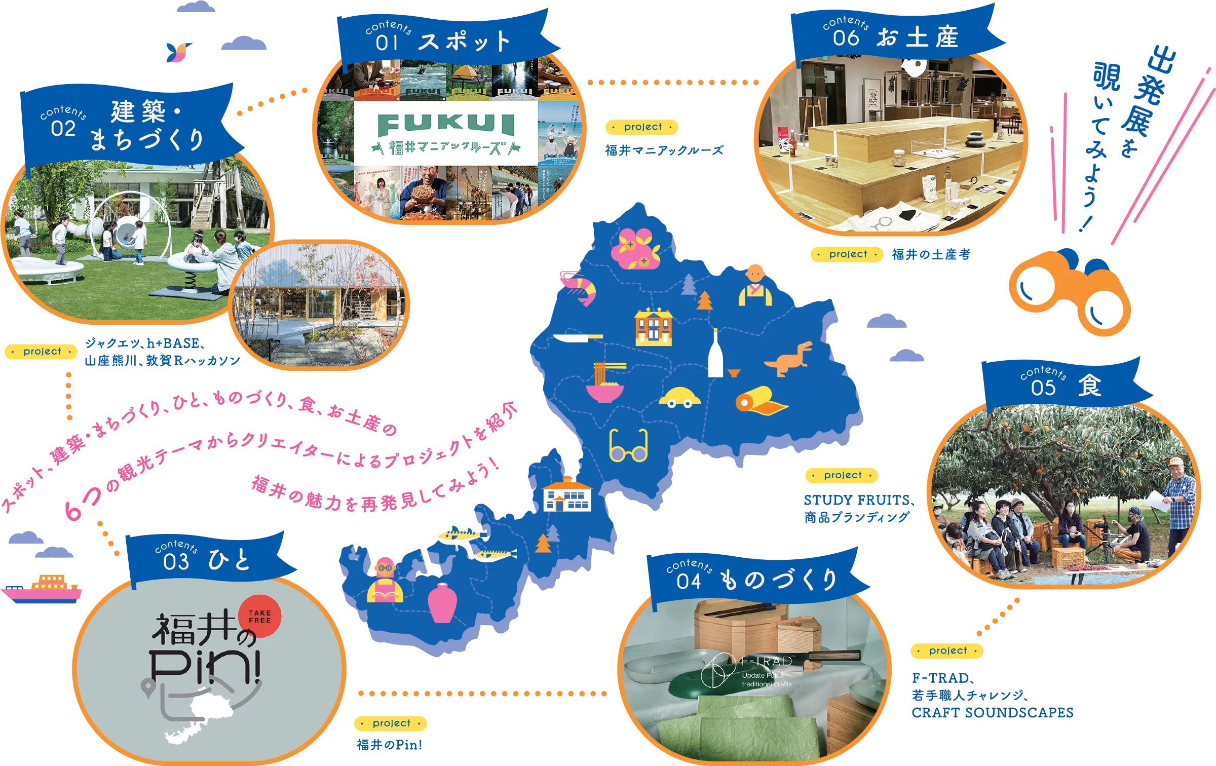 展覧会の楽しみ方を、スポット・建築・ものづくり・食・お土産の6つの観光テーマからクリエイターによるプレジェクトを紹介します。あなたの知らない福井の楽しみ方、魅力を再発見してみよう!