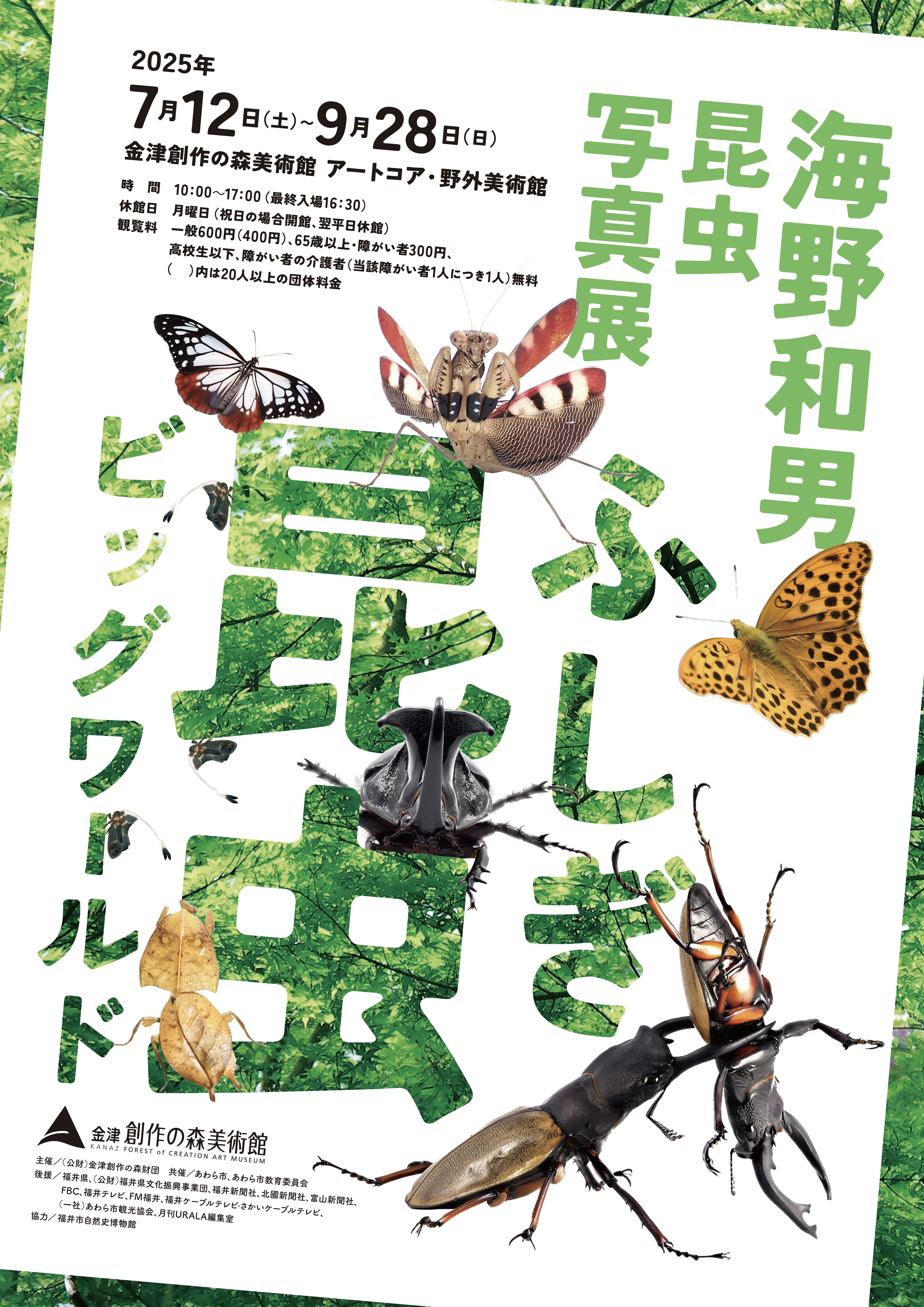 国内外を飛び回り、現地に生息する昆虫を長年撮影し続けている、世界的な昆虫写真家・海野和男による、金津創作の森美術館初の昆虫の写真展を開催します。本展では、約100万種を超える昆虫の世界から、馴染み深いカブトやクワガタ、国内外の美しい蝶、さらには普段目にすることのない珍しい昆虫まで、約175点の写真作品を展示し、まるで虫の世界に迷い込んだかのような空間を繰り広げます。また、森の敷地を生かした昆虫スタンプラリーを開催し、昆虫の魅力を存分に味わいながら、自然の奥深さに触れ、昆虫の小さな世界を全身でお楽しみください。