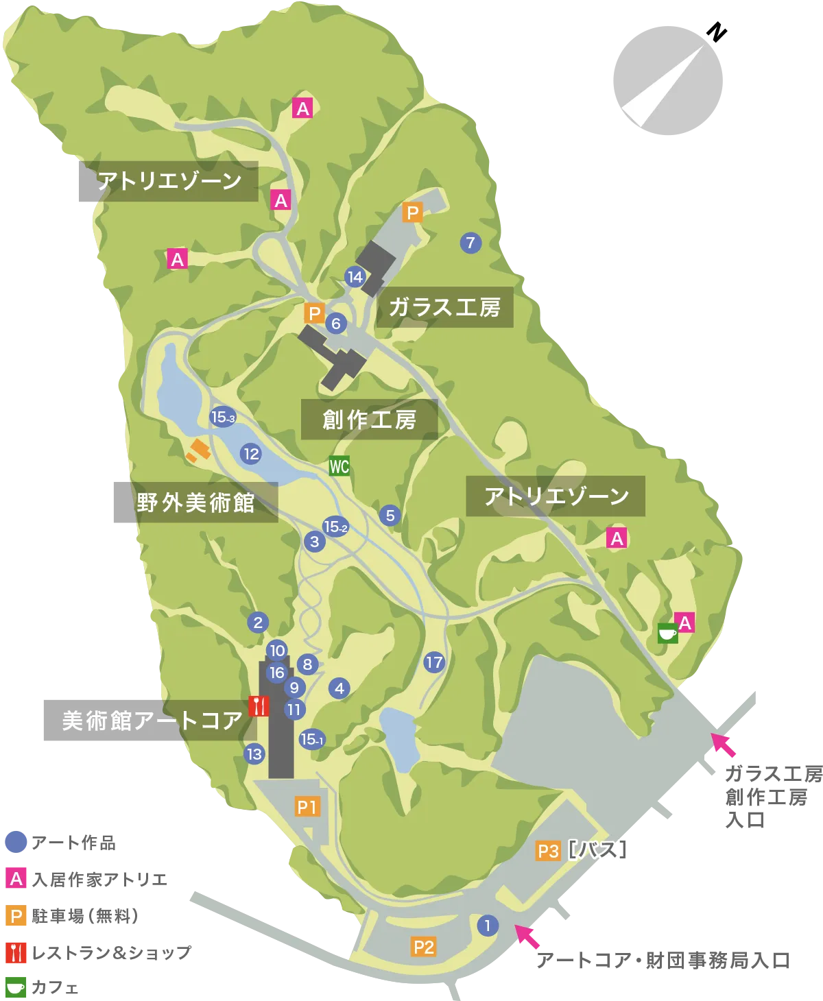 《MOON TOWER(月の塔)》は、長坂が平和の象徴として繰り返し描き「月」を モチーフにしたモニュメントです。2019年、ガーナ・アグボグブロシーの人々とともに 廃棄されたペットボトルを用いて初めて制作され、現地のスラムに希望の光をもたらしました。その後、大学や企業との技術連携によって、3Dプリンター技術や 植物由来素材、ソーラーパネル発電などを融合させた新たな《月の塔》が2022年 に小豆島で発表されています。金津創作の森の《MOON TOWER》は、こうした制作の歩みを継承しつつ、地元の中学生や地域住民のボランティアとともに新規制作されたものです。塔の構造部分は、日本の伝統的な大工技術を基盤に独自の造形を追求する大工アーティスト・菱田昌平 氏が手掛けました。木材の経年による色調の変化は、森の自然環境と呼応しながら、作品そのものが時間とともに呼吸するかのように変容していきます。