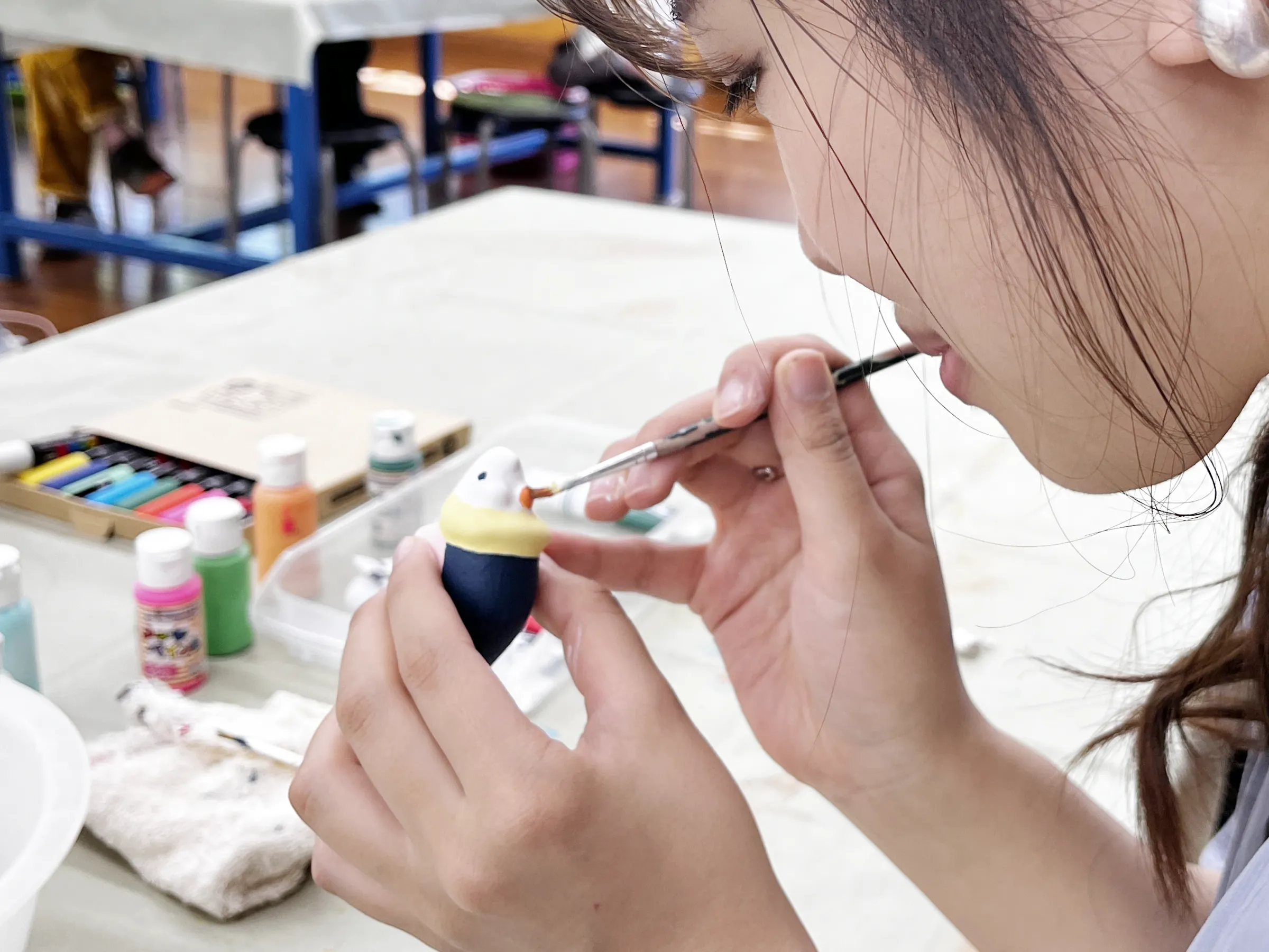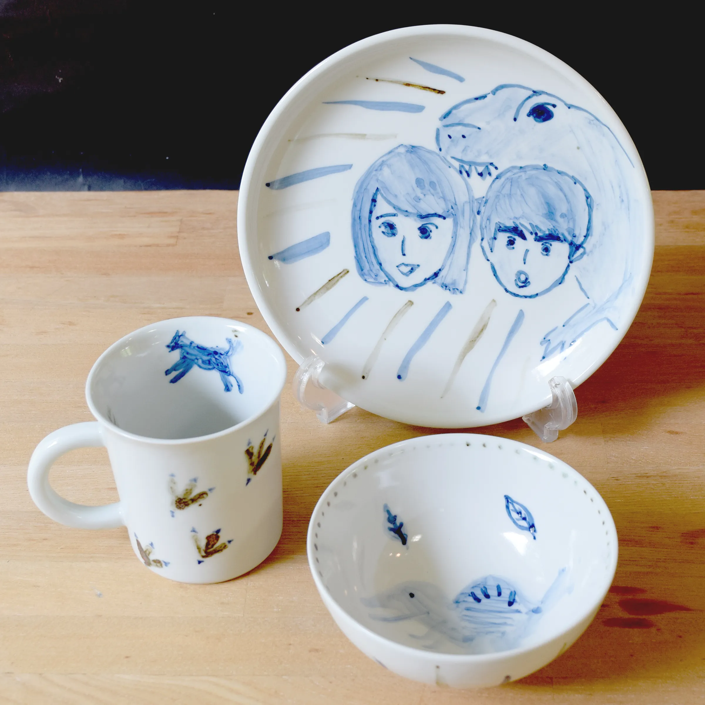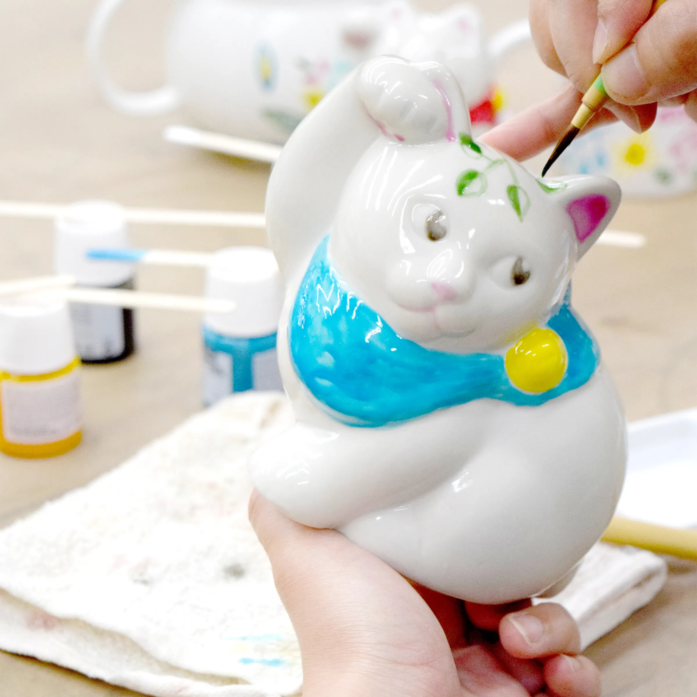 マグカップ、人形などいろいろな種類の中からお好きなものを選び、エナメル絵具で自由に絵を描きます。絵付け後、その場で焼成し、当日お持ち帰りいただけます。